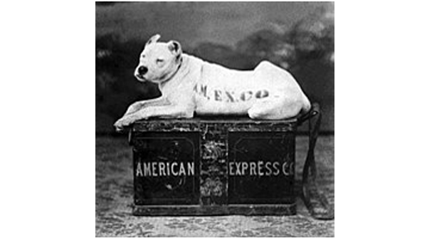 The first American Express emblem embraced the style of the era: an ornate illustration featuring a large lockbox with “Am. Ex. Co.” written on the front. A black dog lay protectively on top, symbolizing loyalty, vigilance, and security. Executed in bold black and white, the design conveyed seriousness and stability during the company’s early years.