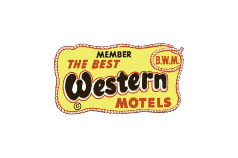 The first Best Western logo introduced in 1946 reflected the brand’s origins as a motel association. The emblem consisted of a monochrome banner featuring a large “Western” wordmark in a rounded custom typeface. Above it appeared “The Best” in a slanted serif style, while “Motels” was placed below in a modern sans-serif.