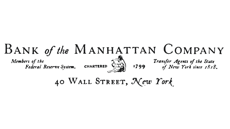 The earliest logo introduced in 1799 was a purely typographic composition. Featuring ornate serif lettering, the logo displayed the full name “Bank of the Manhattan Company,” along with the date of establishment and address. Rendered in monochrome, this design reflected the formal conventions of early American banking and remained in use for nearly a century.