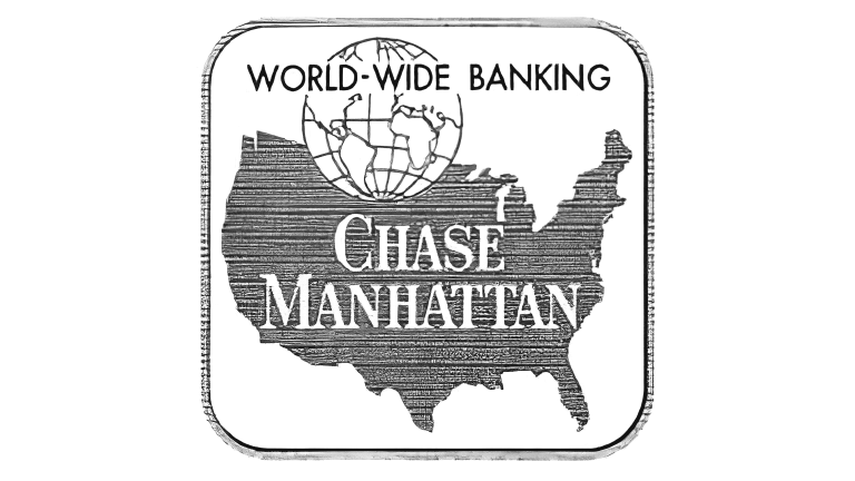In 1955, Chase introduced its first logo with graphical elements. A rounded square frame enclosed a stylized outline of the United States, topped by a globe. The phrase “World-Wide Banking” appeared above the globe, while “Chase Manhattan” was placed prominently within the U.S. shape. This design communicated international ambition and marked a turning point toward symbolic branding.