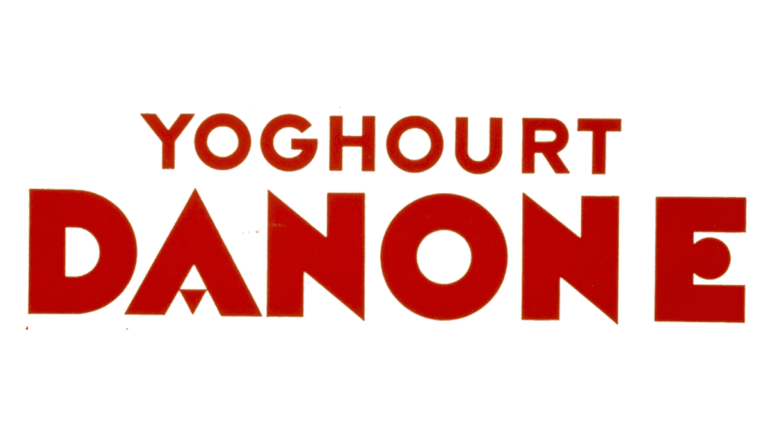 The very first Danone logo, introduced at the brand’s birth in 1919, featured bold uppercase lettering executed in a striking red. Its geometric sans-serif structure conveyed stability and modernity, while small artistic interventions—the triangular crossbar in the “A” and a circular middle stroke in the “E”—created a distinctive visual language. For nearly fifty years, this minimal yet energetic mark defined the company, symbolizing early ambition and industrial confidence.