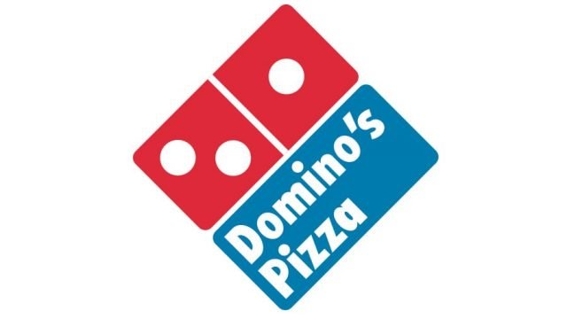 The current Domino’s logo, introduced in 2012, embraces minimalism and clarity. The red and blue domino emblem with three white dots is placed diagonally to the left of a clean, light blue “Domino’s” wordmark.