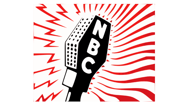 NBC’s first emblem reflected its origins in radio broadcasting. A central microphone stood over a map of the United States, framed by lightning bolts representing transmission and national reach. The thick, curved “NBC” lettering crowned the composition, marking the company’s identity during the earliest years of American network radio.