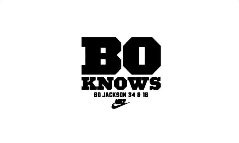 In 1989, the “Bo Knows” campaign showcases multi-sport star Bo Jackson, supported by a clean, bold “BO” logotype. Minimal but strong, it adds another facet to Nike’s identity, emphasizing versatility and crossover appeal.