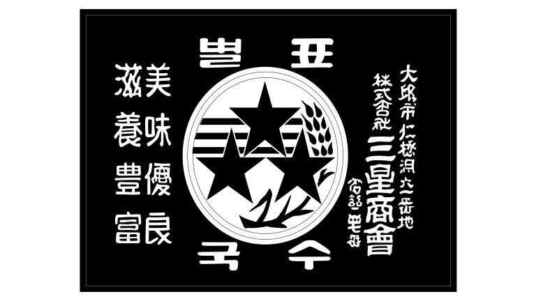 Samsung’s first logo resembled a formal Korean seal. Circular, intricate, and symbolic, it contained Hangul characters, rice stalks, stripes, and the famous three stars.