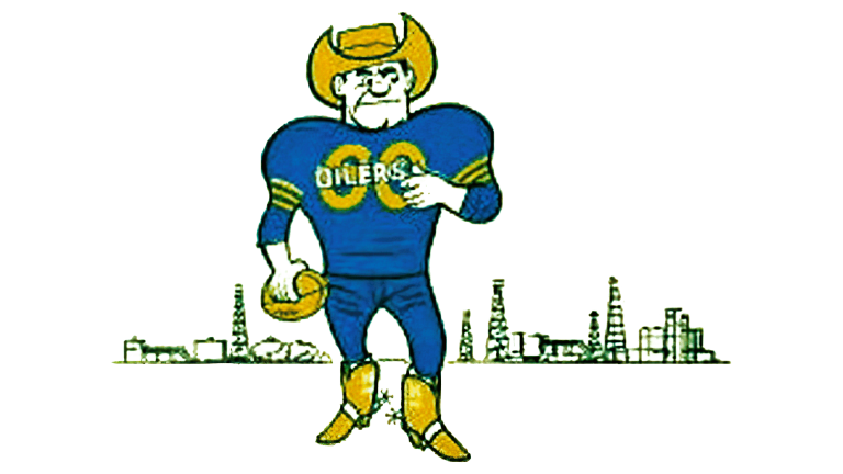 The first logo featured a human figure blending elements of a cowboy and a football player. Wearing a cowboy hat and holding a football, the character stood in front of oil derricks, clearly referencing Texas’ oil heritage. Blue and gold dominated the palette, reinforcing prosperity and strength.