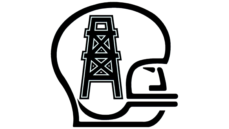 In 1969, the logo was fully abstracted. A football helmet silhouette outlined in black featured an oil derrick at its center. This marked a decisive move away from character-based imagery toward symbolic representation.