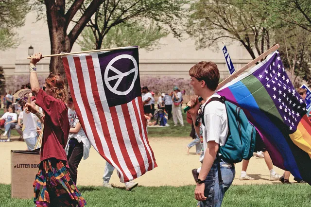 It quickly appeared on signs, banners, clothing, and the now-famous peace flags, which blended the American flag with the circular symbol to imagine a nation grounded in peace rather than perpetual conflict.